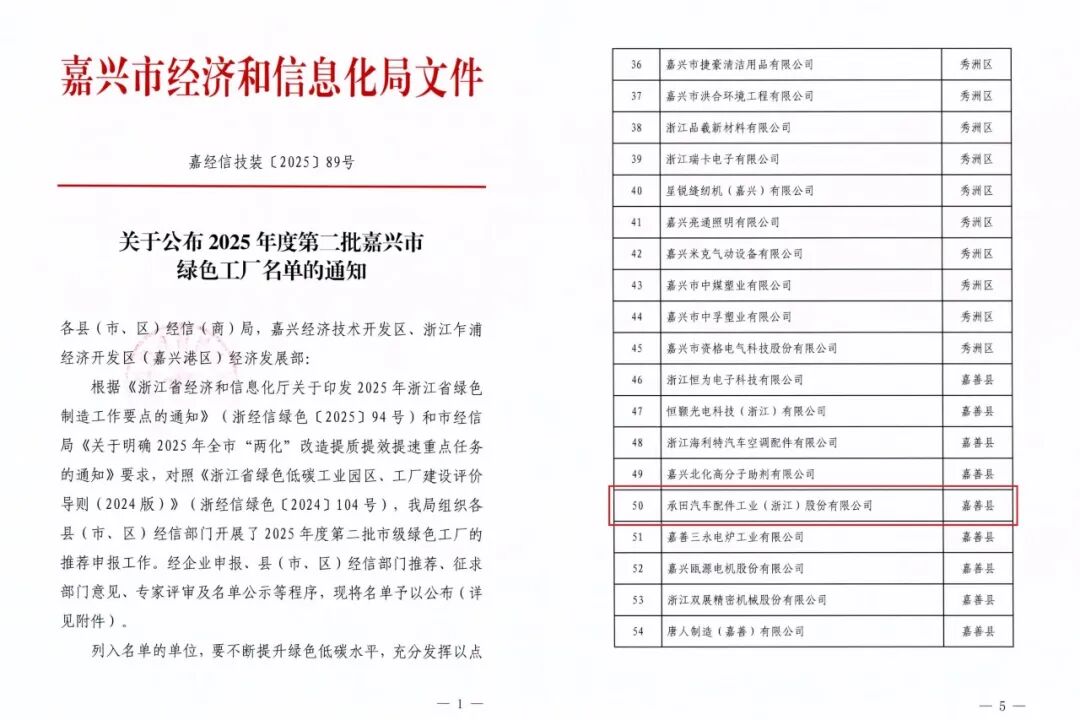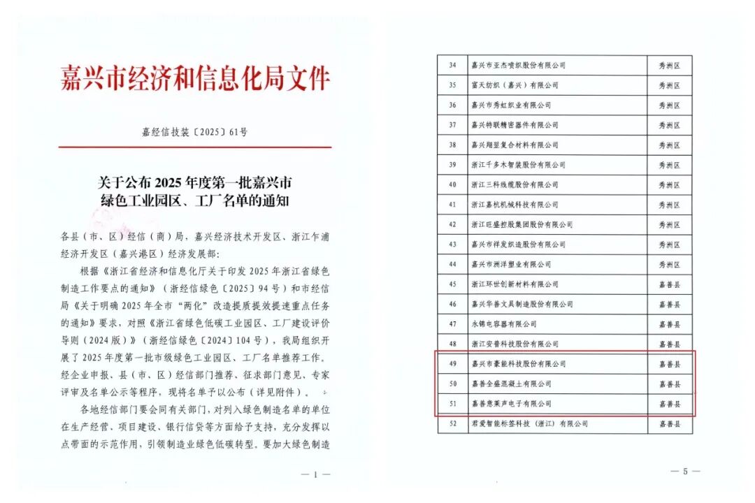 近日,嘉兴市经济和信息化局公布了2025年度第一批和第二批嘉兴市绿色工厂名单,嘉善归谷智造小镇4家企业入选市级绿色工厂,分别是嘉兴市豪能科技股份有限公司、嘉善全盛混凝土有限公司、嘉善意莱声电子有限公司以及承田汽车配件工业(浙江)股份有限公司。
